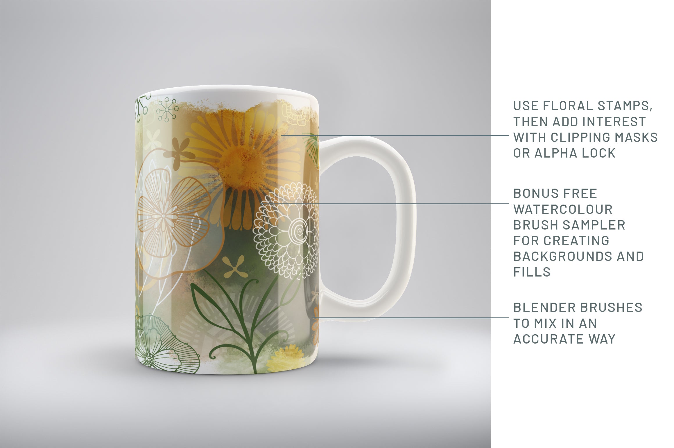 The Massive Collection Zen Inspired Brushes and Borders includes 100 high resolution custom made brushes with unique brush shapes. I’ve included the Watercolour Background Brushes of 10 brushes and for surprising finishes for underpainting or adding texture to the motifs with the aid of either clipping masks or alpha lock.